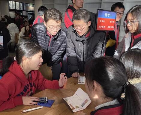 活动现场火热而有序,餐厅门口,大大的“专业超市”立牌吸引着来往学生的目光;餐厅内,高高的专业超市指引牌立在桌面,学生一眼就可以看到一切专业的分布状况。现场秩序井然——校门处、签到处,专业货摊等都有专门的志愿者和教师担任引导。学生在活动中遇到困难时,都能在第一时间得到协助。 当天参加活动的包括高一和高二学生。还没到开始时间,同学们就按捺不住内心的好奇和兴奋,早早地来到了活动现场。同学们都对专业超市满怀期待,希望能经过向校友咨询,协助自己明确专业挑选。 两个小时的活动中,专业货摊边人头攒动,校友们尽心尽力,细致耐心肠回答同学们的各种问题。校友们为了更好地展现自己的大学和专业,也都做了精心预备——有的校友带来了所在大学的招生简章和招生海报,有的则预备了学校的专业目录册和精巧的校园明信片,有的校友甚至做了专业介绍的PPT,俨然就是一名宣传专员。同学们或围成圈,火热讨论,不时迸发出阵阵笑声;或一对一,抛出各式各样的问题,眨着“星星眼”专注地听着校友们的解说。有些校友现已接连参加了四届的专业超市,对“超市”已熟门熟路,颇有大咖范儿;也有些是刚结业的2019届学生,第一次作为校友返校。除了完结“超市”作业,校友们还结伴去看望阔别已久的老师,畅叙师生情。
